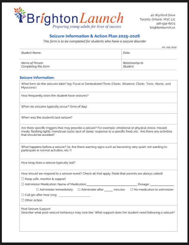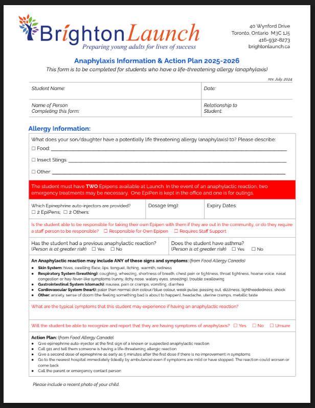 If you have indicated on our Student Information Form that you require a Medication Administration Request Form, Anaphylaxis Information & Action Plan Form, or Seizure Information & Action Plan Form, please download and complete the appropriate forms below. They should be returned before the first day of Launch.